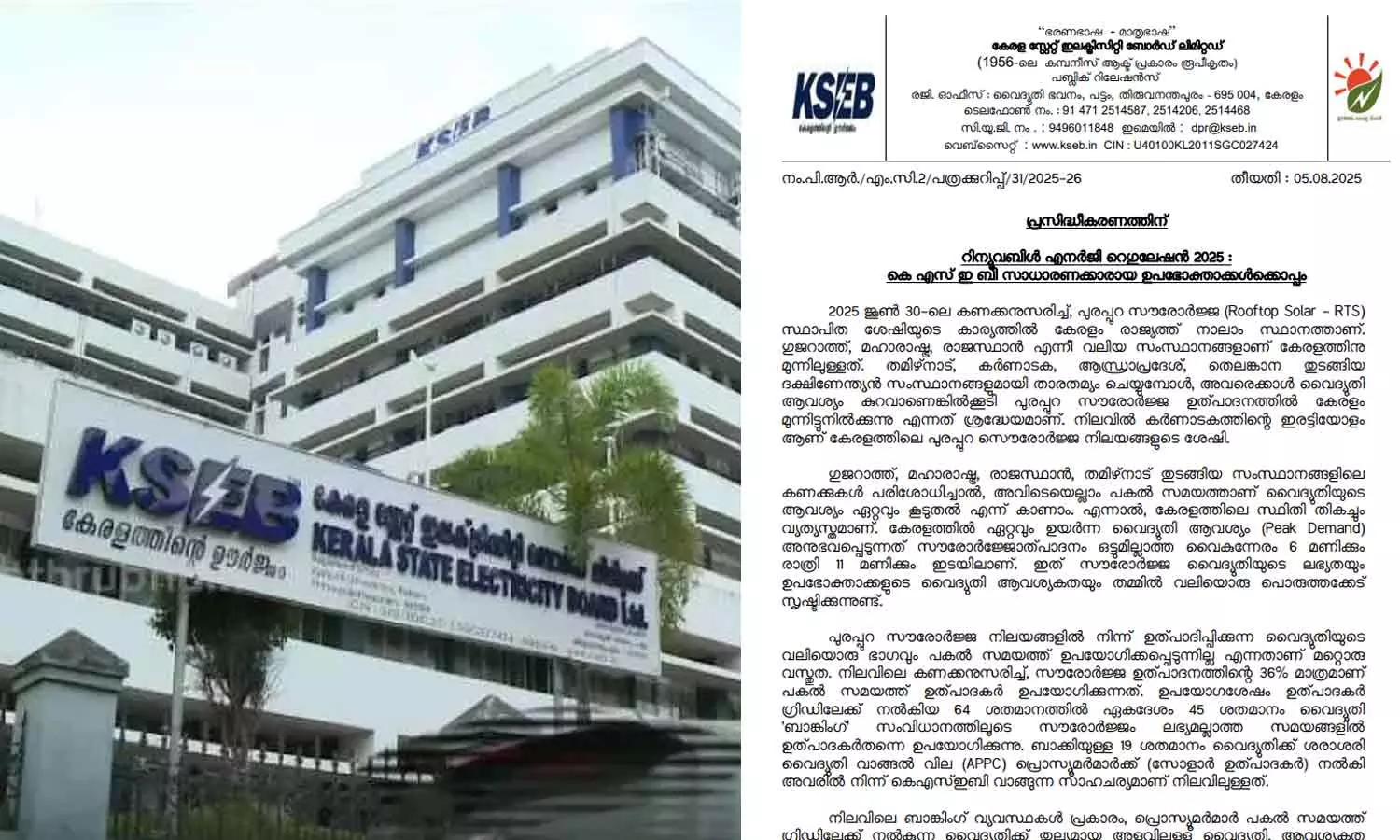 പകൽ സൗരോർജ ഉപയോഗം 36% മാത്രം; പുരപ്പുറ സോളാർ പദ്ധതി ബാധ്യതയെന്ന് കെഎസ്ഇബി