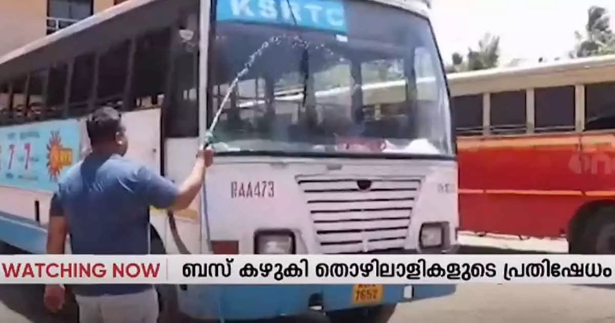 ശമ്പളമില്ല; ബസ് കഴുകി പ്രതിഷേധിച്ച് കെ.എസ്.ആര്.ടി.സി ജീവനക്കാര്