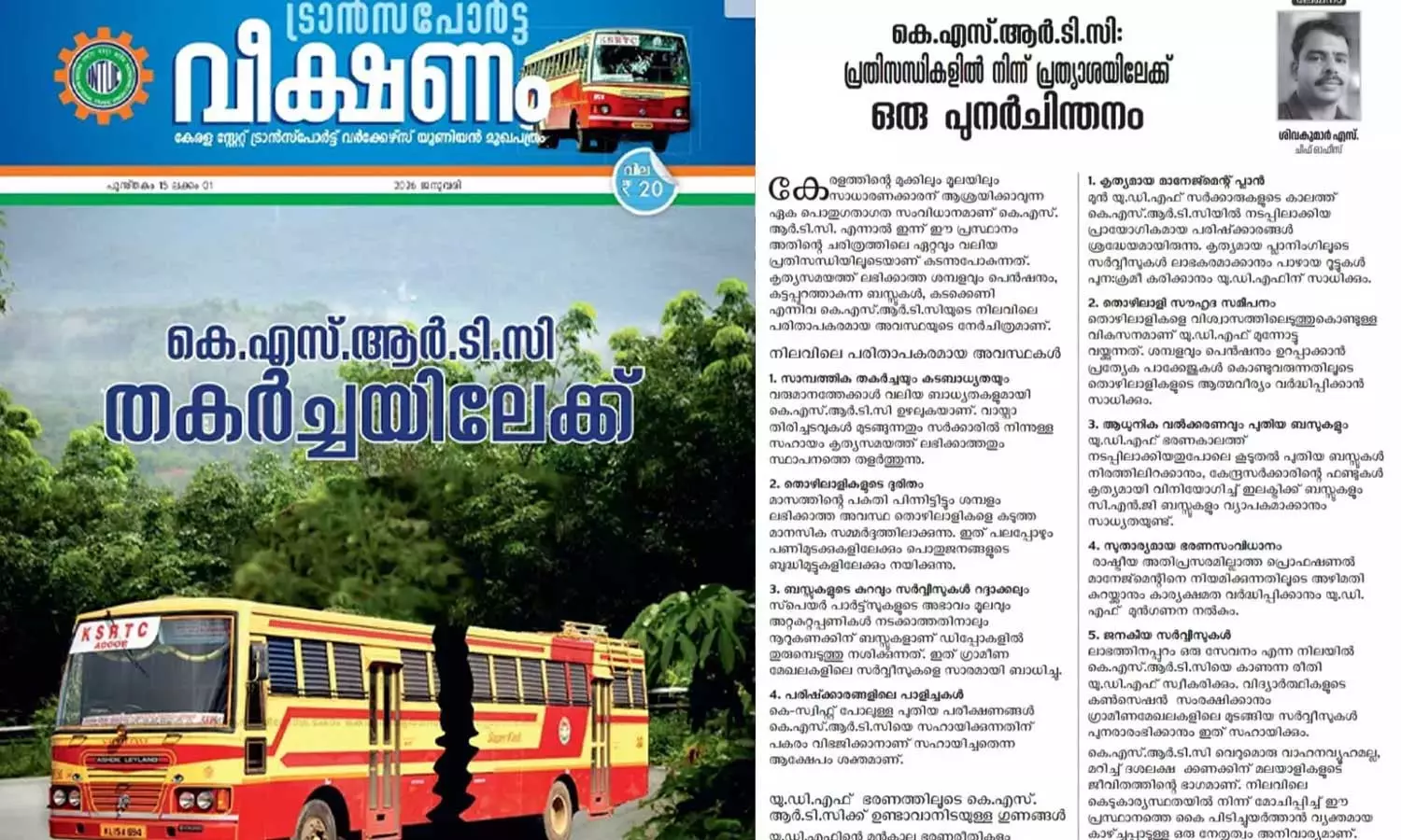 'കെഎസ്ആർടിസി; പ്രതിസന്ധികളിൽ നിന്ന് പ്രത്യാശയിലേക്ക് ഒരു പുനർവിചിന്തനം' എന്ന തലക്കെട്ടിൽ കോൺഗ്രസ് അനുകൂല വാരികയിലെഴുതിയ ലേഖനത്തിന്റെ പേരിലായിരുന്നു നടപടി. കെഎസ്ആർടിസി നേരിടുന്ന കെടുകാര്യസ്ഥതയിൽ നിന്ന് മോചിപ്പിച്ച് ഈ പ്രസ്ഥാനത്തെ കൈപിടിച്ചുയർത്താൻ വ്യക്തമായ കാഴ്ചപ്പാടുള്ള നേതൃത്വം അനിവാര്യമാണെന്നും യുഡിഎഫിന്റെ വികസനമാതൃകകൾക്ക് കെഎസ്ആർടിസിയുടെ പഴയ പ്രതാപം തിരിച്ചുപിടിക്കാനാകുമെന്ന് പ്രതീക്ഷിക്കാമെന്നും ലേഖനത്തിലുണ്ട്. കൃത്യസമയത്ത് ലഭിക്കാത്ത ശമ്പളം, പെൻഷൻ, കട്ടപ്പുറത്തിരിക്കുന്ന ബസുകൾ, കടക്കെണി എന്നിങ്ങനെ നിലവിൽ കെഎസ്ആർടിസി നേരിടുന്ന പ്രതിസന്ധികൾ എണ്ണിയെണ്ണി പറയുന്നുണ്ട് ലേഖനത്തിൽ.