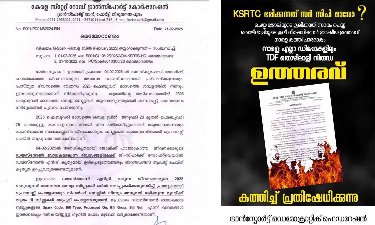 പണിമുടക്കിൽ പ്രതികാര നീക്കവുമായി കെഎസ്ആർടിസി മാനേജ്മെന്റ്; ശമ്പള ബിൽ വൈകി എഴുതിയാൽ മതിയെന്ന് ഉത്തരവിറക്കി