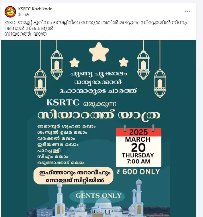 റമദാനിൽ സിയാറത്ത് യാത്രയുമായി കെഎസ്ആർടിസി; യാത്ര പുരുഷന്മാർക്ക് മാത്രം