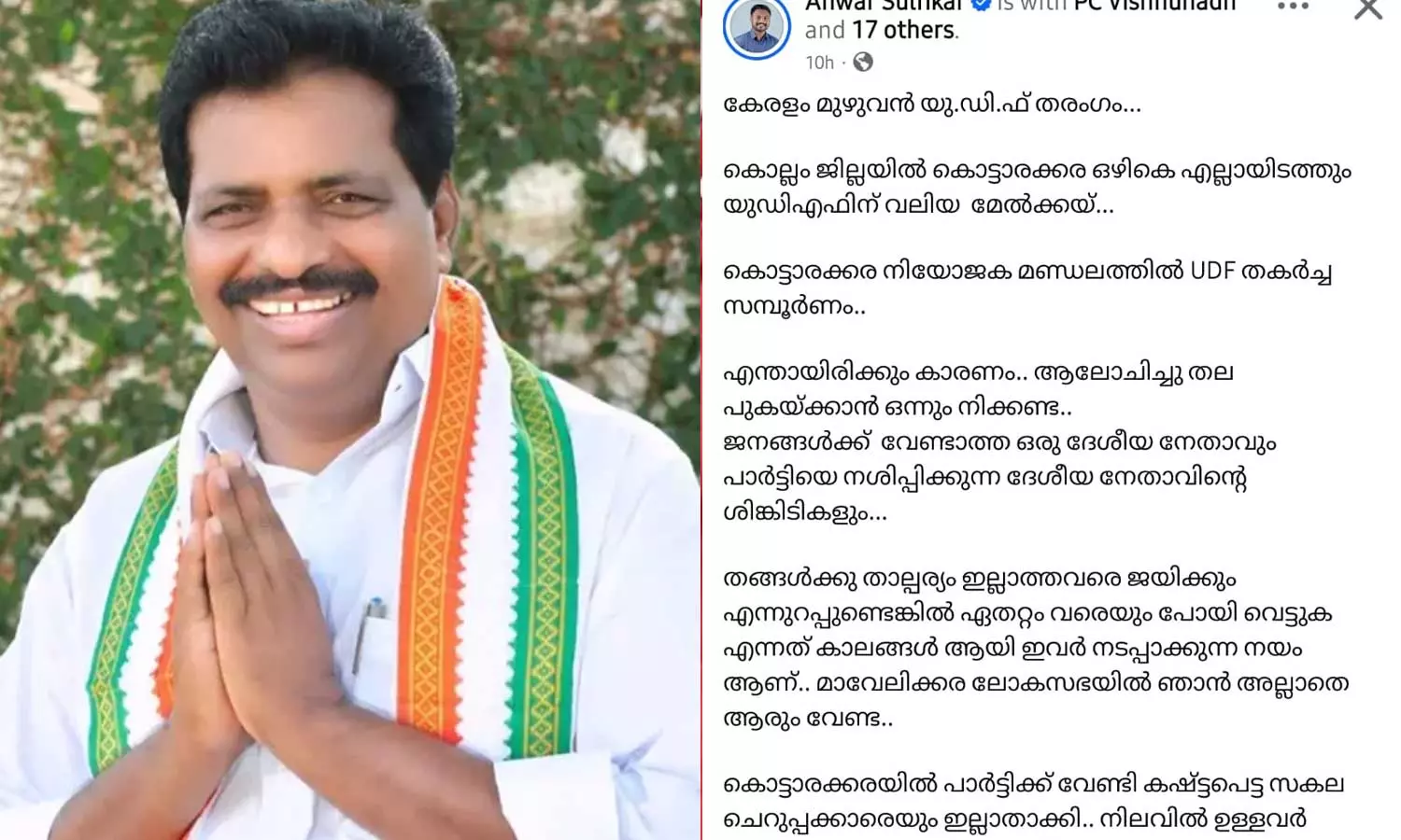 |കൊട്ടാരക്കരയിൽ പാർട്ടിക്ക് വേണ്ടി കഷ്ടപ്പെട്ട സകല ചെറുപ്പക്കാരെയും ഇല്ലാതാക്കിയെന്നും അൻവർ സുൽഫികറിന്റെ ഫേസ്ബുക്ക് കുറിപ്പ്