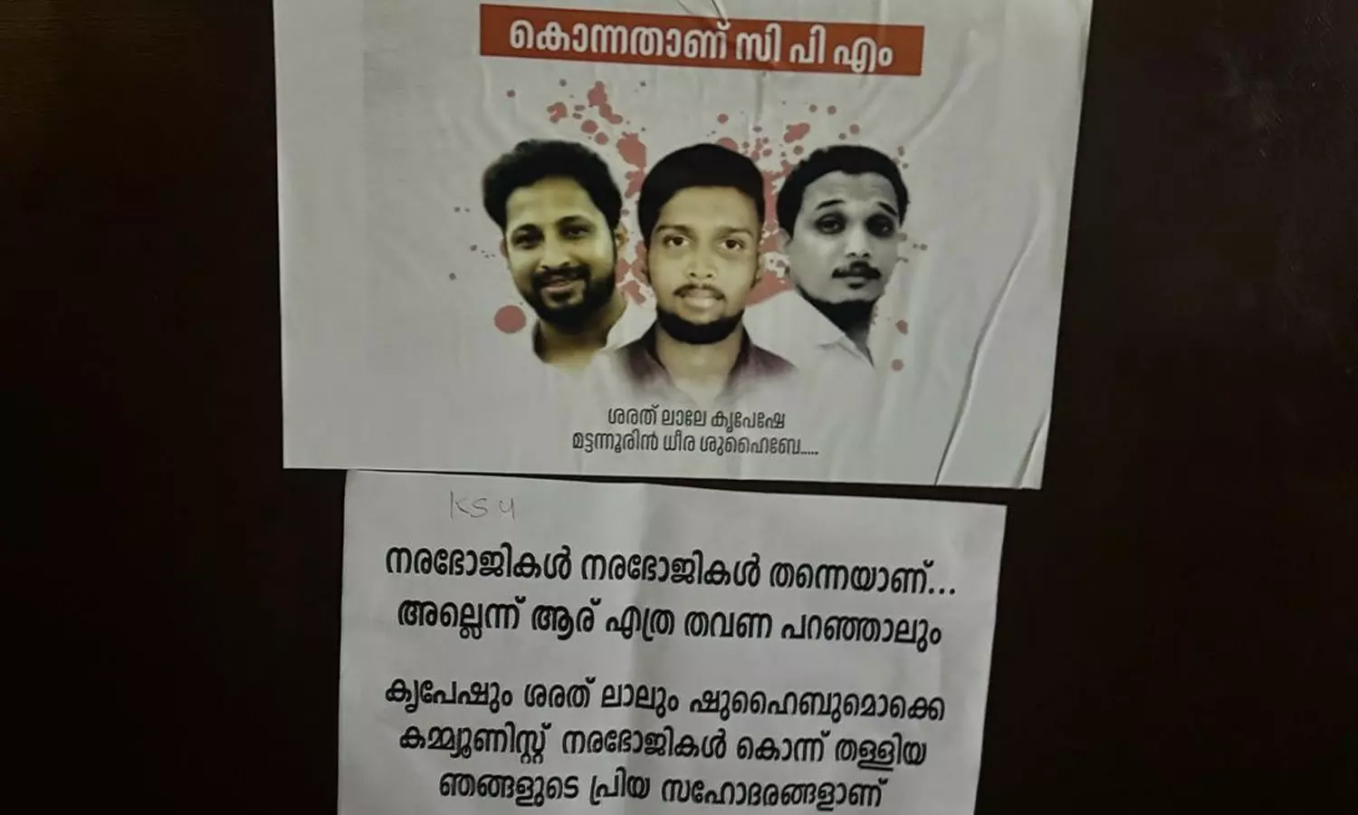 'നരഭോജികൾ നരഭോജികൾ തന്നെയാണ്, അല്ലെന്ന് ആര് എത്ര തവണ പറഞ്ഞാലും. ശുഹൈബ്, കൃപേഷ്, ശരത് ലാൽ എന്നിവർ കമ്മ്യൂണിസ്റ്റ് നരഭോജികൾ കൊന്നുതള്ളിയ സഹോദരങ്ങൾ' എന്നാണ് പോസ്റ്ററിൽ എഴുതിയിരിക്കുന്നത്.