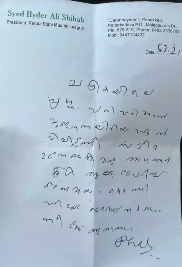 പാണക്കാട് സയ്യിദ് ഹൈദരലി ശിഹാബ് തങ്ങൾ ചന്ദ്രികയിലെ പ്രശ്നങ്ങൾ തീർക്കാൻ മകൻ മുഈനലിയെ ഏൽപിച്ചതായി സ്വന്തം കൈപ്പടയിൽ എഴുതിയ കത്തിന്റെ കോപ്പിയാണ് ഇമേജായി നൽകിയിരിക്കുന്നത്. ഇന്നലെ കോഴിക്കോട് ലീഗാഫീസിൽ ചന്ദ്രികയുടെ ബാധ്യതകളുമായി ബന്ധപ്പെട്ട കാര്യങ്ങൾ വിശദീകരിക്കാൻ വിളിച്ചു ചേർത്ത പത്രസമ്മേളനത്തിൽ വലിഞ്ഞുകയറി ചെന്നതല്ല സയ്യിദ് മുഈനലി തങ്ങൾ എന്ന് വ്യക്തമാക്കുന്ന രേഖയാണ് ഇത്. മുസ്ലിംലീഗ് സംസ്ഥാന ജനറൽ സെക്രട്ടറി ഇന്നലെ വൈകുന്നേരം മാധ്യമങ്ങൾക്ക് നൽകിയ വാർത്താകുറിപ്പിൽ പറഞ്ഞത് ആരും ഉത്തരവാദിത്തം ഏൽപിക്കാതെയാണ് മുഈനലി തങ്ങൾ വാർത്താസമ്മേളനത്തിൽ പങ്കെടുത്തത് എന്നാണ്. മുഈനലി തങ്ങളെ കേട്ടാൽ അറപ്പുളവാക്കുന്ന തെറിയഭിഷേകം നടത്തിയ കുഞ്ഞാലിക്കുട്ടിയുടെ സന്തതസഹചാരിയായ ഗുണ്ടക്കെതിരെ ഒരു ലീഗ് നേതാവും ഇതുവരെ ഒരക്ഷരം ഉരിയാടിയതായി കണ്ടില്ല. ഈ സാഹചര്യത്തിൽ ചികിൽസയിൽ കഴിയുന്ന സമാദരണീയനായ പാണക്കാട് സയ്യിദ് ഹൈദരലി ശിഹാബ് തങ്ങൾക്കും അദ്ദേഹത്തെ പരിചരിക്കുന്ന മകൻ മുഈനലി തങ്ങൾ ഉൾപ്പടെയുള്ള കുടുംബാംഗങ്ങൾക്കും ആവശ്യമായ സംരക്ഷണം സർക്കാർ ഒരുക്കണം.