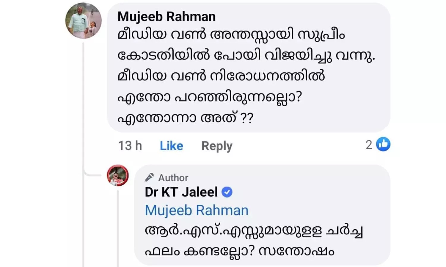 മലപ്പുറം: മീഡിയവൺ കേസിലെ സുപ്രിംകോടതി വിധി ആർഎസ്എസ്സുമായി നടത്തിയ നടത്തിയ ചർച്ചയുടെ ഫലമെന്ന് ഇടതുമുന്നണി എംഎൽഎ കെ.ടി ജലീൽ. തന്നെ ഭീകരവാദിയെന്ന് വിളിച്ച ബിജെപി നേതാവിനെതിരെ കേസ് കൊടുക്കാൻ ഉദ്ദേശിക്കുന്നില്ല എന്നറിയിച്ചു കൊണ്ടുള്ള ഫേസ്ബുക്ക് പോസ്റ്റിന് കീഴെ ഉന്നയിക്കപ്പെട്ട ചോദ്യത്തിന് മറുപടിയായാണ് ജലീലിന്റെ പ്രതികരണം. സുപ്രിം കോടതിയുടെ ഒരു വിധി കോടതിക്ക് പുറത്ത് നടന്ന ഏതോ ചർച്ചയുടെ ഫലമായുണ്ടായതാണ് എന്ന പരാമർശം കോടതിയലക്ഷ്യ നടപടികൾ ആകർഷിക്കാൻ പര്യാപ്തമാണ്. 'മീഡിയവൺ അന്തസ്സായി സുപ്രിംകോടതിയിൽ പോയി വിജയിച്ചുവന്നു. മീഡിയവൺ നിരോധനത്തിൽ എന്തോ പറഞ്ഞിരുന്നല്ലോ? എന്തോന്നാ അത്?' - എന്നാണ് ഒരാൾ കെ.ടി ജലീലിനോട് ചോദിക്കുന്നത്. ഇതിന് മറുപടിയായി 'ആർ.എസ്.എസ്സുമായുള്ള ചർച്ച ഫലം കണ്ടല്ലോ? സന്തോഷം' എന്നാണ് ജലീൽ മറുപടി നൽകുന്നത്.
