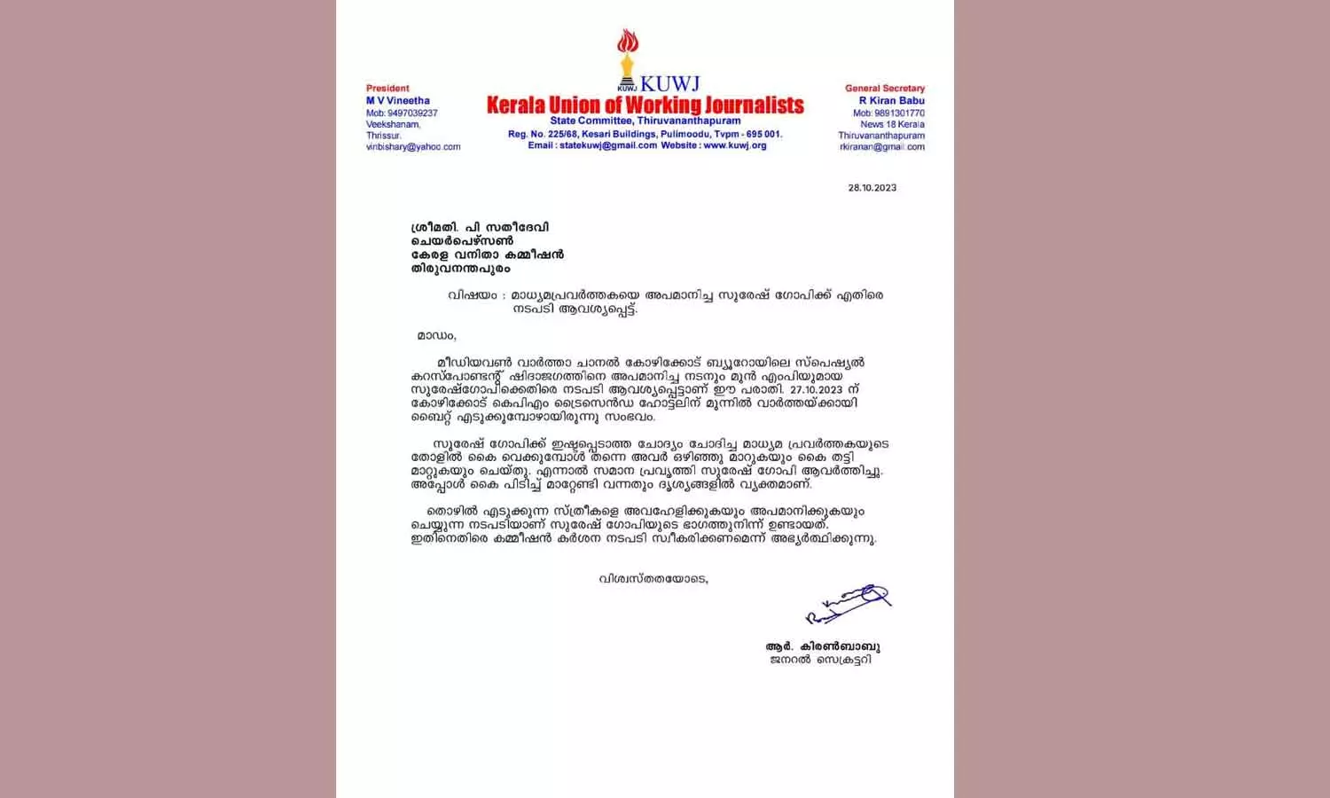 |തൊഴിലെടുക്കുന്ന സ്ത്രീകളെ അവഹേളിക്കുകയും അപമാനിക്കുകയും ചെയ്യുന്ന നടപടിയാണ് സുരേഷ് ഗോപിയുടെ ഭാഗത്തുനിന്ന് ഉണ്ടായതെന്ന് കെ.യു.ഡബ്ല്യു.ജെ പരാതിയിൽ പറയുന്നു.
