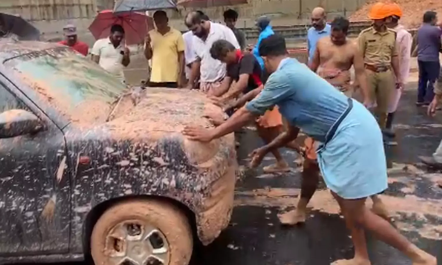 കാസർകോട് ചെറുവത്തൂർ ദേശീയപാതയിൽ അധ്യാപികയുടെ കാറിന് മുകളിൽ മണ്ണിടിഞ്ഞു
