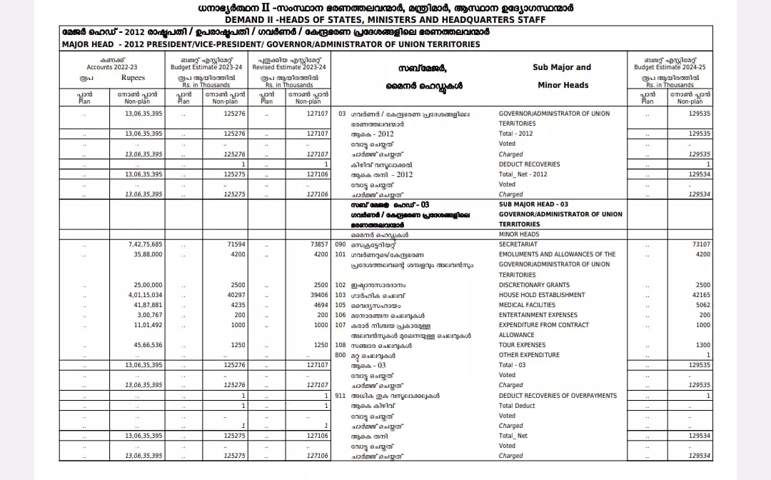|ഗവർണറുടെ ശമ്പളമായി 42 ലക്ഷം രൂപയാണ് ബജറ്റ് എസ്റ്റിമേറ്റ്