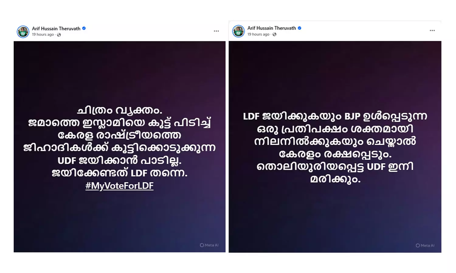 'എൽഡിഎഫ് ജയിക്കുകയും ബിജെപി ഉൾപ്പെടുന്ന ഒരു പ്രതിപക്ഷം ശക്തമായി നിലനിൽക്കുകയും ചെയ്താൽ കേരളം രക്ഷപെടും. തൊലിയുരിയപ്പെട്ട യുഡിഎഫ് ഇനി മരിക്കും', 'ചിത്രം വ്യക്തം. ജമാഅത്തെ ഇസ്ലാമിയെ കൂട്ടുപിടിച്ച് കേരള രാഷ്ട്രീയത്തെ ജിഹാദികൾക്ക് കൂട്ടിക്കൊടുക്കുന്ന യുഡിഎഫ് ജയിക്കാൻ പാടില്ല. ജയിക്കേണ്ടത് എൽഡിഎഫ് തന്നെ. #MyVoteForLDF'- എന്നിങ്ങനെയാണ് ഇയാളുടെ ഫേസ്ബുക്ക് പോസ്റ്റുകൾ.