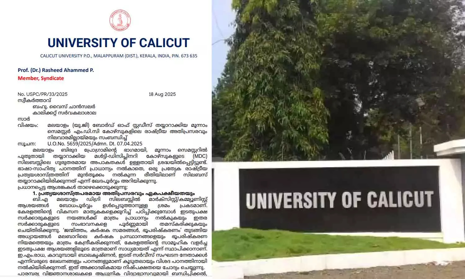 'കമ്യൂണിസ്റ്റ് ആശയങ്ങളുടെ അതിപ്രസരം'; കാലിക്കറ്റ് സർവകലാശാല ബിഎ മലയാളം സിലബസിനെതിരെ പരാതിയുമായി സിൻഡിക്കേറ്റ് അംഗം
