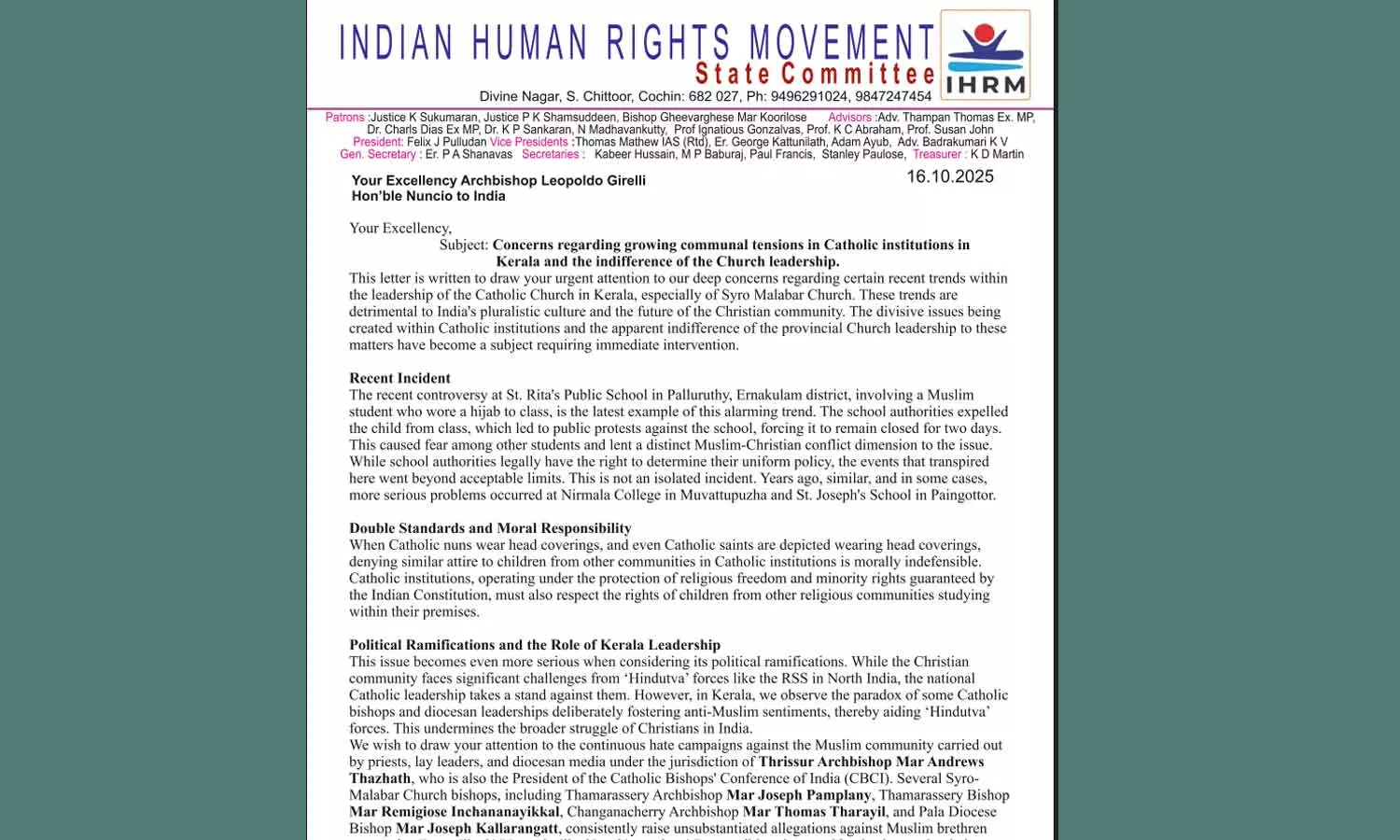 കത്തോലിക്കാ സന്യാസിനികൾ ശിരോവസ്ത്രം ധരിക്കുമ്പോൾ, മറ്റ് സമുദായങ്ങളിലെ കുട്ടികൾക്ക് സമാനമായ വസ്ത്രധാരണ രീതിക്ക് അനുമതി നിഷേധിക്കുന്നത് ധാർമികമായി ന്യായീകരിക്കാനാവാത്തതാണെന്ന് കത്ത് വ്യക്തമാക്കുന്നു. ഇന്ത്യൻ ഭരണഘടന ഉറപ്പുനൽകുന്ന മതസ്വാതന്ത്ര്യം മാനിക്കാൻ കത്തോലിക്കാ സ്ഥാപനങ്ങൾക്ക് ഉത്തരവാദിത്തമുണ്ടെന്നും കത്തിൽ പറയുന്നു. ഉത്തരേന്ത്യയിൽ ഹിന്ദുത്വ ശക്തികളിൽ നിന്ന് ക്രൈസ്തവർ വെല്ലുവിളികൾ നേരിടുമ്പോൾ, കേരളത്തിലെ ചില കത്തോലിക്കാ മെത്രാന്മാരും രൂപതാ നേതൃത്വങ്ങളും ബോധപൂർവം മുസ്ലിം വിരുദ്ധ വികാരം വളർത്തി ഹിന്ദുത്വ ശക്തികൾക്ക് സഹായം ചെയ്യുന്നതായി കത്തിൽ ആരോപിക്കുന്നു. ഇത് ദേശീയതലത്തിലെ ക്രൈസ്തവ പോരാട്ടത്തെ ദുർബലപ്പെടുത്തുമെന്നും കത്ത് മുന്നറിയിപ്പ് നൽകുന്നു.