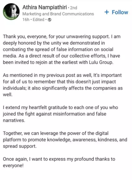 വ്യാജ വാർത്തയ്ക്കെതിരെ നിലകൊണ്ടതിനും പിന്തുണച്ചതിനും എല്ലാവർക്കും നന്ദി അറിയിക്കുന്നതായി ആതിര നമ്പ്യാതിരി വ്യക്തമാക്കി. എത്രയും വേഗം ജോലിയിൽ തിരികെ പ്രവേശിക്കണമെന്ന് ലുലു ഗ്രൂപ്പ് അറിയിച്ചതായും അവർ കൂട്ടിച്ചേർത്തു.