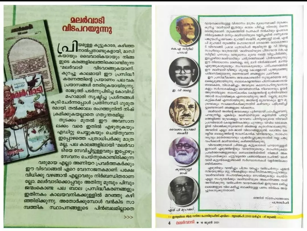 മലർവാടി ചരിത്രത്തിലേക്ക് പിൻവാങ്ങുമ്പോൾ, അതൊരു മാറിനിൽക്കൽ മാത്രമാണെന്നും മരണമല്ലെന്നും വീണ്ടും തിരിച്ചു വരുമെന്ന പ്രതീക്ഷയുമാണ് പത്രാധിപർ പങ്കുവക്കുന്നത്.
