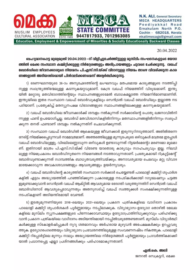 ഭരണഘടനയുടെ 26ാം അനുഛേദത്തിന്റെ ലംഘനവും മറ്റൊരു മതസ്ഥാപനത്തിന്റെയും മേലില്ലാത്ത നിയമവുമായതിനാൽ സംസ്ഥാന വഖഫ് ബോർഡ് നിയമനം പി.എസ്.സിക്ക് വിട്ടത് സർക്കാർ പിൻവലിക്കണമെന്ന് മുഖ്യമന്ത്രി പിണറായി വിജയൻ വിളിച്ചുചേർക്കുന്ന മുസ്ലിം സംഘടനകളുടെ യോഗത്തിൽ ആവശ്യപ്പെടുമെന്ന് 'മെക്ക' ജനറൽ സെക്രട്ടറി എൻ.കെ അലി. ബോർഡിലെ ജീവനക്കാർക്ക് ശമ്പളം നൽകുന്നത് സർക്കാറിന്റെ പൊതുഖജനാവിൽനിന്നല്ലെന്നും വിശ്വാസികളിൽനിന്നും മതസ്ഥാപനങ്ങളിൽനിന്നും സ്വരൂപിക്കുന്ന തനത് ഫണ്ടാണ് ഇതിന് ഉപയോഗിക്കുന്നതെന്നും അദ്ദേഹം വാർത്താകുറിപ്പിൽ ചൂണ്ടിക്കാട്ടി.