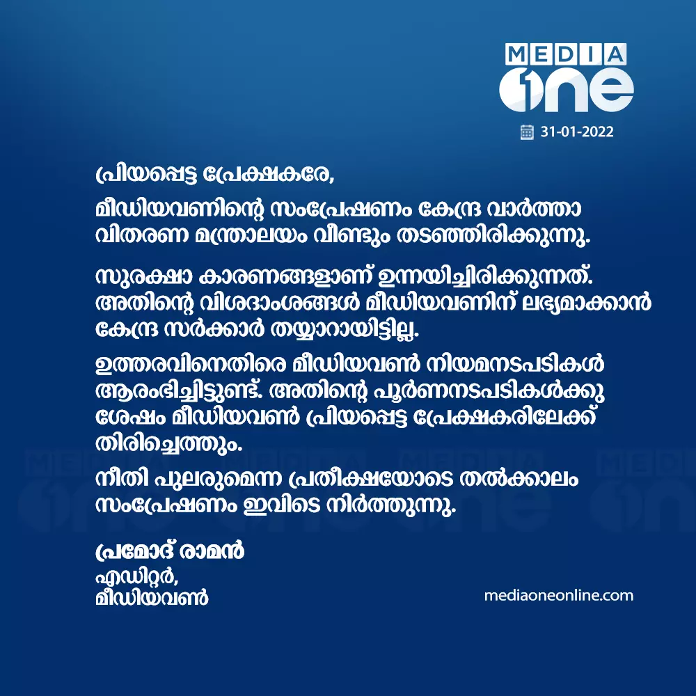 മീഡിയവണിന്റെ സംപ്രേഷണം കേന്ദ്ര വാർത്താ വിതരണ മന്ത്രാലയം വീണ്ടും തടഞ്ഞിരിക്കുന്നു. സുരക്ഷാ കാരണങ്ങളാണ് ഉന്നയിച്ചിരിക്കുന്നത്. അതിന്റെ വിശദാംശങ്ങൾ മീഡിയവണിന് ലഭ്യമാക്കാൻ കേന്ദ്ര സർക്കാർ തയ്യാറായിട്ടില്ല.