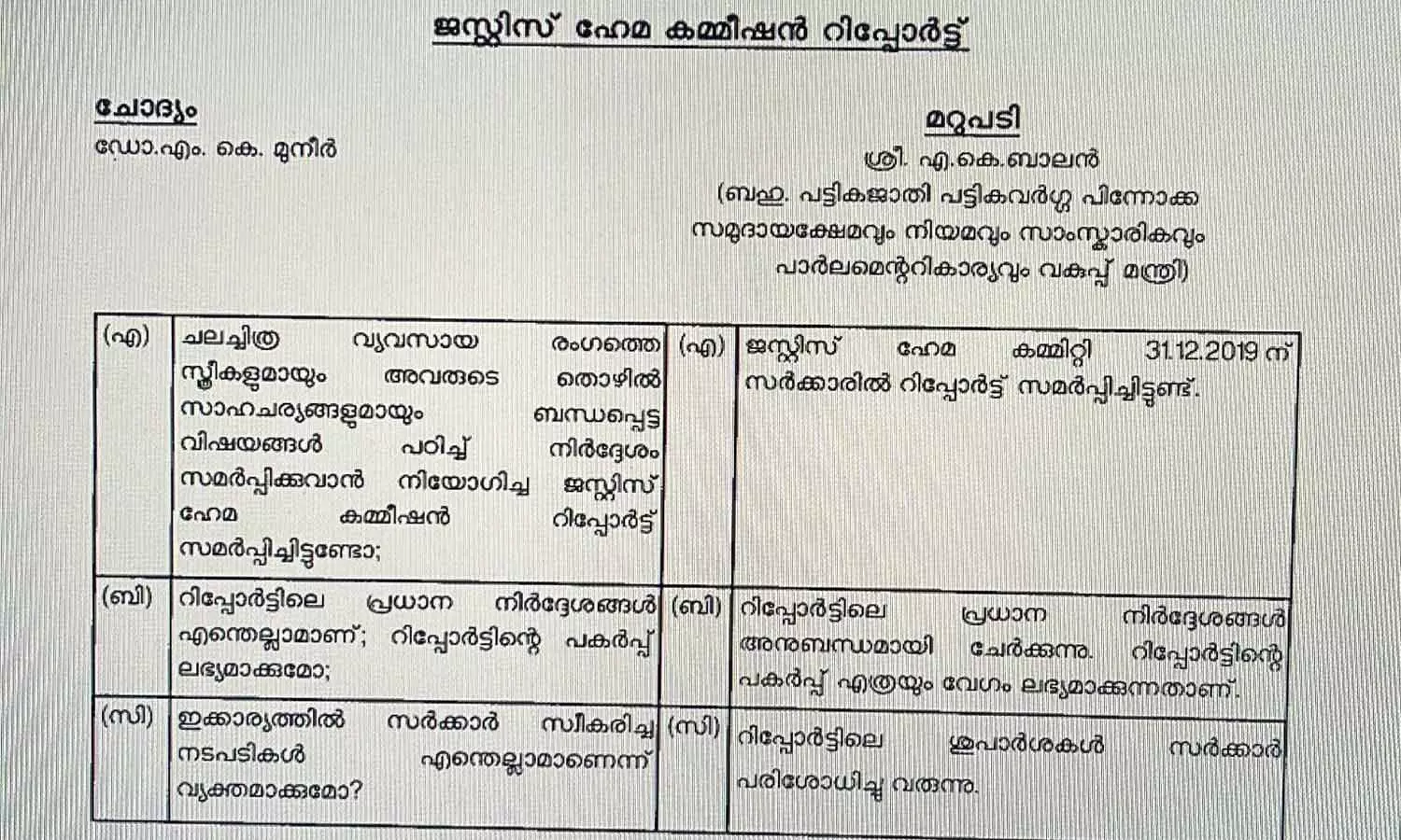 'ഹേമാ കമ്മിറ്റി റിപ്പോർട്ടിൽ സർക്കാരിന് ഒളിച്ചുകളി': നടപടിയുണ്ടാവുമെന്ന് 2020ൽ മന്ത്രി നിയമസഭയിൽ ഉറപ്പ് നൽകി