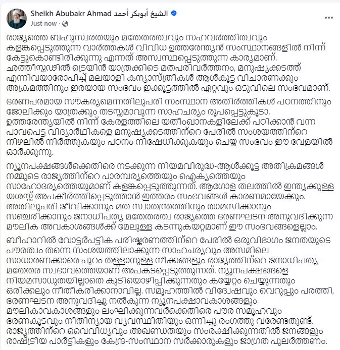 കോഴിക്കോട്: ന്യൂനപക്ഷങ്ങൾക്കെതിരെ നടക്കുന്ന നിയമവിരുദ്ധ-ആൾക്കൂട്ട അതിക്രമങ്ങൾ നമ്മുടെ രാജ്യത്തിന്റെ പാരമ്പര്യത്തെയും ഐക്യത്തെയും സാഹോദര്യത്തെയുമാണ് കളങ്കപ്പെടുത്തുന്നതെന്ന് കാന്തപുരം അബൂബക്കർ മുസ്ലിയാർ. ഫേസ് ബുക്കിലെഴുതിയ കുറിപ്പിലാണ് ഛത്തീസ്ഗഢിൽ കന്യാസ്ത്രീകൾക്കുനേരെയുണ്ടായ അതിക്രമത്തിനെതിരെയും ബീഹാറിൽ വോട്ടർപട്ടിക പരിഷ്കരണത്തിന്റെ പേരിൽ ഒരുവിഭാഗം ജനതയുടെ പൗരത്വം തന്നെ സംശയത്തിലാക്കുന്നതിനെതിരെയും അസമിലെ സാധാരണക്കാരെ പുറം തള്ളാനുള്ള നീക്കങ്ങൾക്കെതിരെയും രംഗത്തെത്തിയത്.