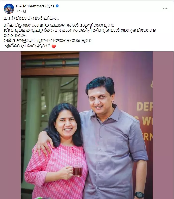 'ഇന്ന് വിവാഹ വാർഷികം. നിലവിട്ട അസംബന്ധ പ്രചരണങ്ങൾ സൃഷ്ടിക്കാവുന്ന,ജീവനുള്ള മനുഷ്യന്റെ പച്ച മാംസം കടിച്ച് തിന്നുമ്പോൾ അനുഭവിക്കേണ്ട വേദനയെ, വർഷങ്ങളായി പുഞ്ചിരിയോടെ നേരിടുന്ന എന്റെ പ്രിയപ്പെട്ടവൾ എന്നാണ് റിയാസ് ഫേസ്ബുക്കിൽ കുറിച്ചത്. ഭാര്യ വീണയ്ക്ക് ഒപ്പമുള്ള ചിത്രത്തോടൊപ്പമാണ് കുറിപ്പ് പങ്കുവെച്ചത്.