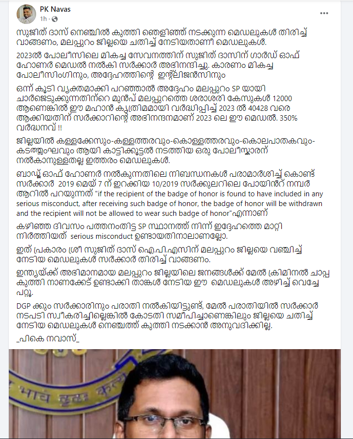 കള്ളക്കേസും കള്ളത്തരവും കൊള്ളത്തരവും കൊലപാതകവും കടത്ത് സംഘവുമായി കാട്ടിക്കൂട്ടൽ നടത്തിയ ഒരു പൊലീസ്കാരന് നൽകാനുള്ളതല്ല ഇത്തരം മെഡലുകളെന്നും നവാസ് പറഞ്ഞു. 2023ൽ പൊലീസിലെ മികച്ച സേവനത്തിന് സുജിത് ദാസിന് ഗാർഡ് ഓഫ് ഹോണർ മെഡൽ നൽകുമ്പോൾ സർക്കാർ വിശദീകരിചത് മികച്ച പൊലീസിങ്ങിനും ഇന്റലിജൻസിനുമാണെന്നാണ്. എന്നാൽ മലപ്പുറം എസ.പിയായി ചാർജെടുക്കുന്നതിന് മുമ്പ് മലപ്പുറത്തെ ശരാശരി കേസുകൾ 12,000 ആണെങ്കിൽ കൃത്രിമമായി വർദ്ധിപ്പിച്ച് 2023 ൽ 40428 വരെ ആക്കിയതിനുള്ള സർക്കാറിന്റെ അഭിനന്ദനമാണ് ഈ മെഡലെന്ന് നവാസ് പറഞ്ഞു. സുജിത് ദാസ് എത്തിയതിന് ശേഷം കേസുകളുടെ എണ്ണത്തിൽ 350% വർദ്ധനവാണുണ്ടായിരിക്കുന്നത്.