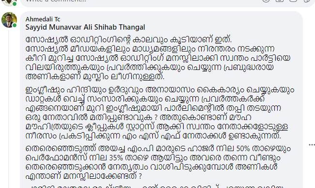 എന്തു കൊണ്ട് തോറ്റു, മുനവ്വറലി തങ്ങളുടെ പോസ്റ്റിന് താഴെ ലീഗണികളുടെ സ്റ്റഡി ക്ലാസ്