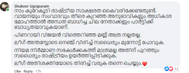 'നാം കുറേകൂടി രാഷ്ട്രീയ സാക്ഷരത കൈവരിക്കേണ്ടതുണ്ട്. വായനയും സംവാദവും തീരെ കുറഞ്ഞ അനുഭാവികളും അധികാര മോഹത്താൽ അന്ധത ബാധിച്ച ചില നേതാക്കളും പാർട്ടിക്ക് ബാധ്യതയാവുകയാണ്. നിയമ നിർമ്മാണ സഭകൾക്കകത്ത് മാത്രമല്ല അതിന് പുറത്തും സധൈര്യം രാഷ്ട്രീയം ഉയർത്തിപ്പിടിക്കുക' - ഗവേഷകനായ ഷുക്കൂർ ഉഗ്രപുരം നിരീക്ഷിച്ചത് ഇങ്ങനെയാണ്.