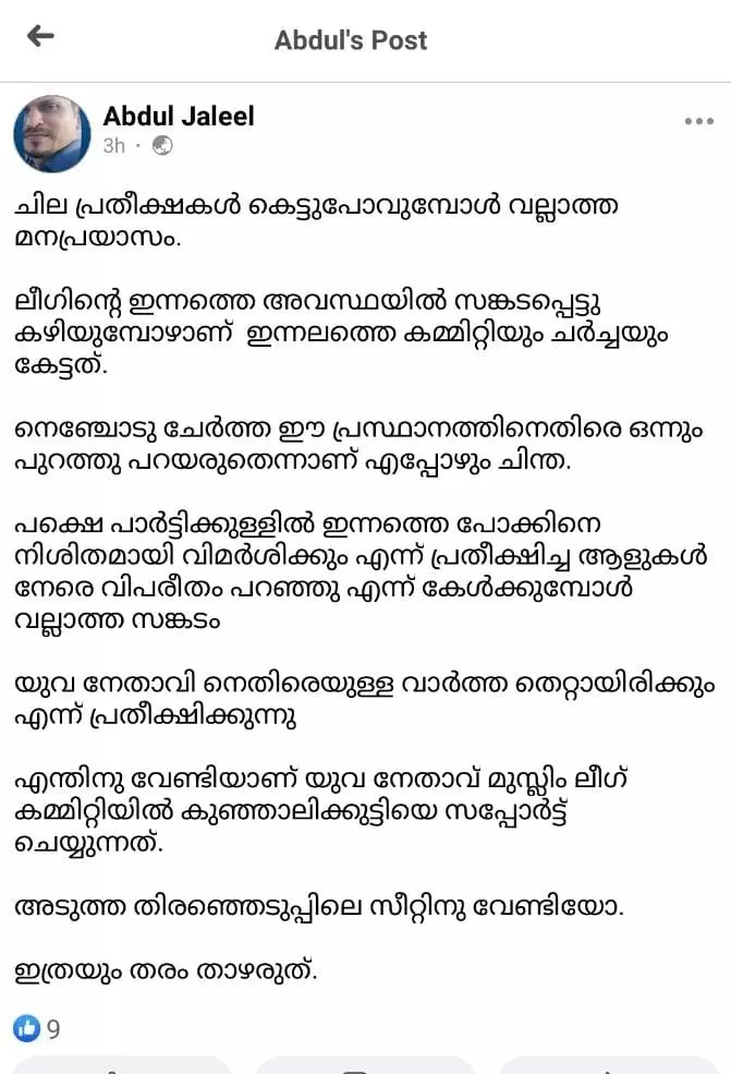 പാര്ട്ടിയുടെ നിലവിലെ പോക്കിനെതിരെ നിശിത വിമര്ശനം ഉന്നയിക്കുമെന്ന് കരുതിയവര് നേര് വിപരീതം പറഞ്ഞു എന്ന് കേള്ക്കുമ്പോള് സങ്കടമുണ്ട്. അടുത്ത തെരഞ്ഞെടുപ്പിലെ സീറ്റിന് വേണ്ടിയാണോ യുവനേതാവ് കുഞ്ഞാലിക്കുട്ടിയെ പിന്തുണക്കുന്നതെന്ന് കെ.എം.സി.സി കുറ്റ്യാടി മണ്ഡലം കെ.എം.സി.സി സെക്രട്ടറിയുടെ ഫെയ്സ്ബുക്ക് പോസ്റ്റില് ചോദിക്കുന്നു.