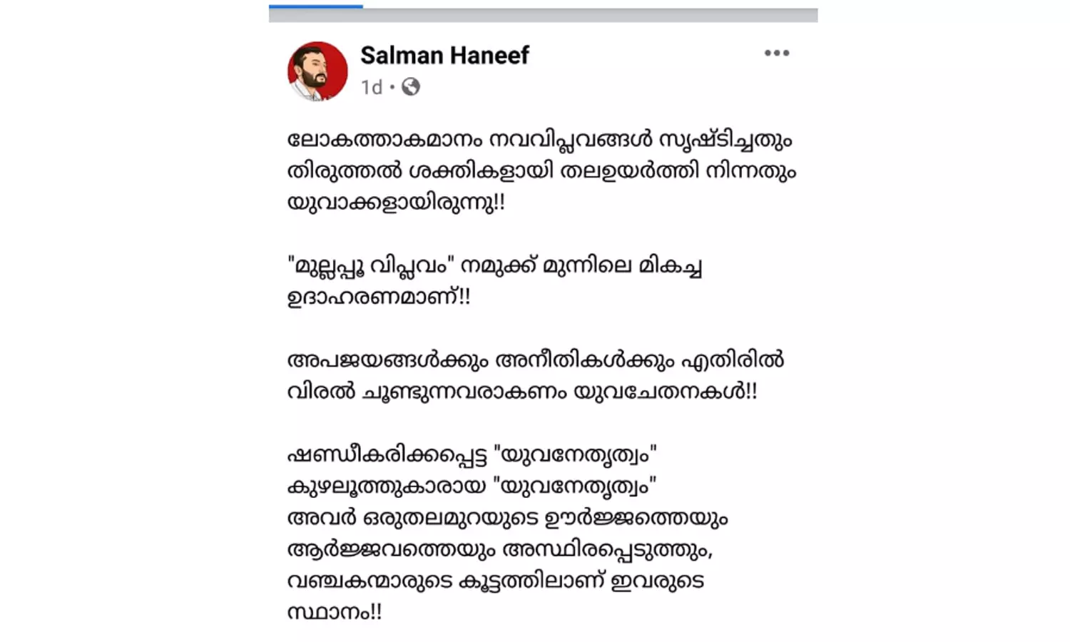 ഷണ്ഡീകരിക്കപ്പെട്ട യുവനേതൃത്വം, കുഴലൂത്തുകാരായ യുവനേതൃത്വം അവര് ഒരു തലമുറയുടെ ഊര്ജത്തെയും ആര്ജവത്തെയും അസ്ഥിരപ്പെടുത്തും. വഞ്ചകന്മാരുടെ കൂട്ടത്തിലാണ് ഇവരുടെ സ്ഥാനം- യൂത്ത്ലീഗ് ഇടുക്കി ജില്ലാ ഭാരവാഹിയായ സല്മാന് ഹനീഫ് പറയുന്നു.