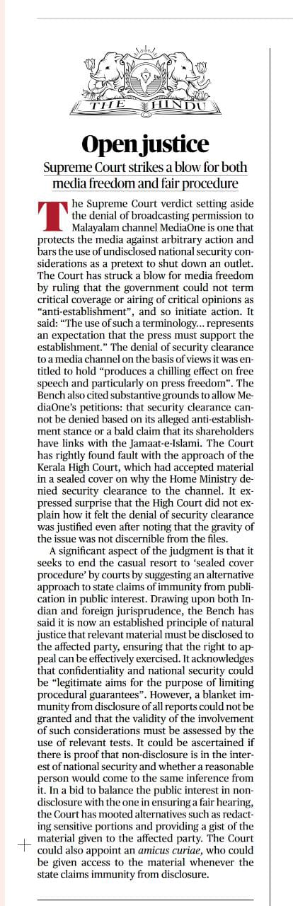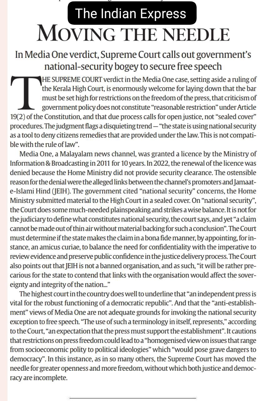 മീഡിയവൺ കേസിലെ സുപ്രിം കോടതി വിധി അങ്ങേയറ്റം സ്വാഗതാർഹമാണ്. അസ്വാരസ്യമുളവാക്കുന്ന ഒരു പ്രവണതയെ അടയാളപ്പെടുത്തുന്നതാണ് ഈ വിധി –"നിയമം അനുശാസിക്കുന്ന പല പരിരക്ഷകളും പൗരൻമാർക്ക് നിഷേധിക്കുവാൻ ദേശീയ സുരക്ഷയെ ഒരു ഉപാധിയാക്കി സ്റ്റേറ്റ് ഉപയോഗിക്കുകയാണ്. ഇത് നീതിന്യായവ്യവസ്ഥക്ക് നിരക്കുന്നതല്ല"