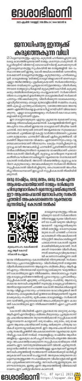 ഒരു ജനാധിപത്യ റിപ്പബ്ലിക്കിന്റെ സുശക്തമായ പ്രവർത്തനത്തിന് ഒരു സ്വതന്ത്ര മാധ്യമപ്രവര്ത്തനം അത്യന്താപേക്ഷിതമാണെന്ന് രാജ്യത്തെ പരമോന്നത കോടതി അടിവരയിടുന്നത് നല്ലതാണ്. മാധ്യമ സ്വാതന്ത്ര്യത്തിന്മേലുള്ള നിയന്ത്രണങ്ങൾ സാമൂഹ്യസാമ്പത്തിക രാഷ്ട്രീയം മുതൽ രാഷ്ട്രീയ പ്രത്യയശാസ്ത്രങ്ങൾ വരെയുള്ള വിഷയങ്ങളിൽ ഏകീകൃത വീക്ഷണത്തിന് ഇടയാക്കുമെന്ന് മുന്നറിയിപ്പ് നൽകുന്നു. അത് ജനാധിപത്യത്തിന് ഗുരുതരമായ അപകടങ്ങൾ സൃഷ്ടിക്കും. ഈ സാഹചര്യത്തില്, മറ്റു പലതിലും എന്ന പോലെ, സുപ്രിംകോടതി കൂടുതൽ സുതാര്യതക്കും കൂടുതൽ സ്വാതന്ത്ര്യത്തിനും വേണ്ടി നിലകൊണ്ടു. അതില്ലാതെ നീതിയും ജനാധിപത്യവും അപൂർണമാണ്.