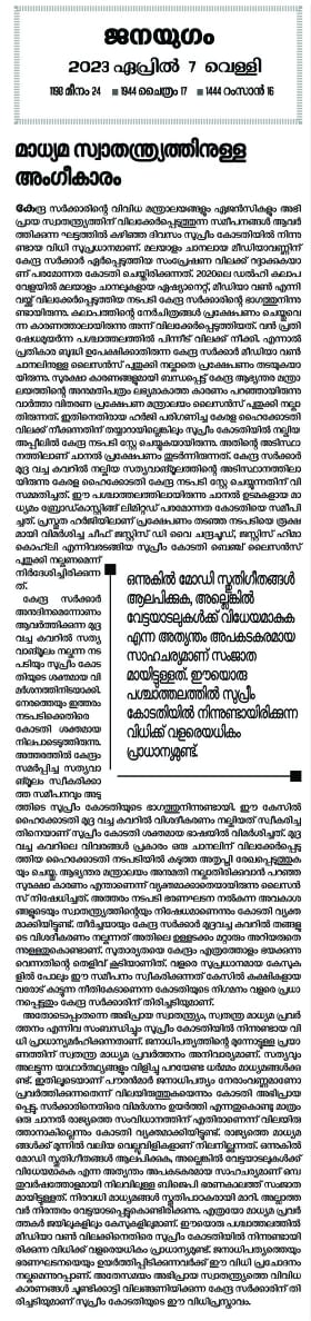 മാധ്യമസ്വാതന്ത്ര്യം നിഷേധിക്കുന്ന മോദി സർക്കാരിനെതിരെയുള്ള രൂക്ഷ വിമർശമാണ് 133 പേജ് വരുന്ന വിധിന്യായമെന്ന് വ്യാഖ്യാനിക്കുന്നതിൽ തെറ്റില്ല. ദേശസുരക്ഷയുടെ പേര് പറഞ്ഞ് പൗരാവകാശങ്ങൾ നിഷേധിക്കാൻ സ്റ്റേറ്റിന് അധികാരമില്ലെന്ന് പരമോന്നത കോടതി വ്യക്തമാക്കിയിരിക്കുകയാണ്.സർക്കാർ നയത്തെ വിമർശിക്കുന്നത് ഭരണകൂടവിരുദ്ധതയായി കാണാനാകില്ലെന്ന ശരിയായ നിരീക്ഷണവും കോടതിയിൽ നിന്നുണ്ടായി. സർക്കാരിനെയും പ്രധാനമന്ത്രിയെയും വിമർശിക്കുന്നത് രാജ്യത്തെ വിമർശിക്കലാണെന്ന ആഖ്യാനം ബിജെപിയും ആർഎസ്എസും നിരന്തരമായി മുന്നോട്ടുവയ്ക്കുന്ന ഘട്ടത്തിലാണ് കോടതിയുടെ ഈ നിരീക്ഷണം.