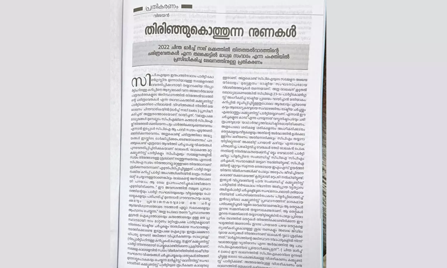 ശരിയും തെറ്റും അംഗീകരിക്കാൻ സി.പി.എമ്മിന് ഒരിക്കലും കഴിഞ്ഞിട്ടില്ല. തെറ്റ് തുറന്നു പറയാതെ പഴയ തെറ്റുകളെ ന്യായീകരിക്കുന്നുവെന്നും ലേഖനത്തിൽ കുറ്റപ്പെടുത്തുന്നു. പിളർപ്പിന് ശേഷം ഇ.എം.എസ് സ്വീകരിച്ച നിലപാടുകൾക്കെതിരെയും ലേഖനത്തിൽ രൂക്ഷ വിമർശനമാണ് ഉന്നയിക്കുന്നത്. നക്സൽബാരി പ്രസ്ഥാനം ഉടലെടുത്തതിന്റെ ഉത്തരവാദിത്വം സി.പി.എമ്മിനാണ്. ഇക്കാര്യത്തിൽ സി.പി.എം സ്വയംവിമർശനം നടത്തണമെന്നും ലേഖനം പറയുന്നു.