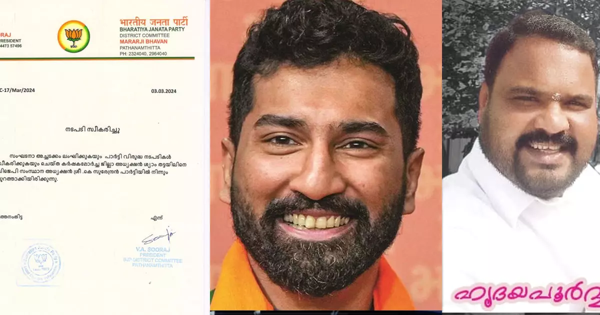 തിരുവനന്തപുരം/പത്തനംതിട്ട: എൻഡിഎ സ്ഥാനാർത്ഥി പ്രഖ്യാപനത്തിന് പിന്നാലെ സംസ്ഥാനത്ത് പലയിടത്തും ബിജെപിയിൽ അഭിപ്രായ ഭിന്നത. പത്തനംതിട്ടയിൽ പിസി ജോർജിനെ വെട്ടി അനിൽ ആൻറണിയെ സ്ഥാനാർഥിയാക്കിയതിനെതിരെ പോസ്റ്റിട്ട കർഷകമോർച്ച ജില്ലാ പ്രസിഡന്റ് ശ്യാം തട്ടയിലിനെ പാർട്ടി നേതൃത്വം പുറത്താക്കി.