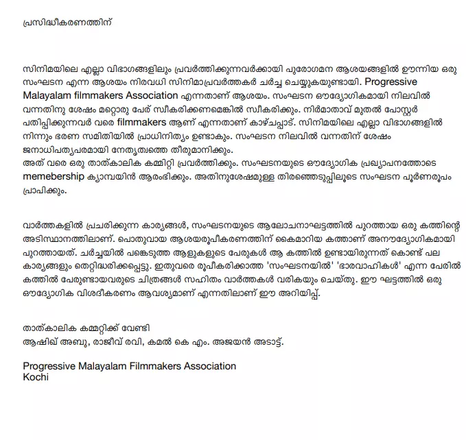 പ്രോഗ്രസീവ് ഫിലിം മേക്കേഴ്സ് എന്ന പേരിലാണ് പുതിയ സംഘടന വരുന്നത്. ആഷിഖ് അബു, അഞ്ജലി മേനോൻ, ലിജോ ജോസ് പെല്ലിശ്ശേരി, രാജീവ് രവി, റിമ കല്ലിങ്കൽ തുടങ്ങിയവരാണ് നേതൃനിരയിലുണ്ടാവുക എന്ന രീതിയിലാണ് വാർത്തകൾ പ്രചരിച്ചിരുന്നത്. എന്നാൽ പ്രോഗ്രസീവ് ഫിലിം മേക്കേഴ്സിൽ ഭാഗമല്ലെന്ന് സംവിധായകൻ ലിജോ ജോസ് പെല്ലിശ്ശേരിയും നിർമാതാവ് ബിനീഷ് ചന്ദ്രയും വ്യക്തമാക്കിയിരുന്നു. നിർമാതാക്കളുടെ സ്വതന്ത്ര കൂട്ടായ്മയോട് താൻ യോജിക്കുന്നുവെന്നും സ്വാഗതം ചെയ്യുന്നുവെന്നും ലിജോ അറിയിച്ചിരുന്നു. പിന്നാലെയാണ് പുതിയ സംഘടനയുടെ ഭാഗമാകാൻ തീരുമാനം എടുത്തിട്ടില്ലെന്ന് അറിയിച്ച് ബിനീഷ് ചന്ദ്രയും രംഗത്ത് എത്തിയത്. ആശയം നല്ലതാണെന്നും കത്തിൽ പേര് വച്ചത് തൻറെ അറിവോടെ അല്ലെന്നും അദ്ദേഹം വിശദീകരിച്ചിരുന്നു.