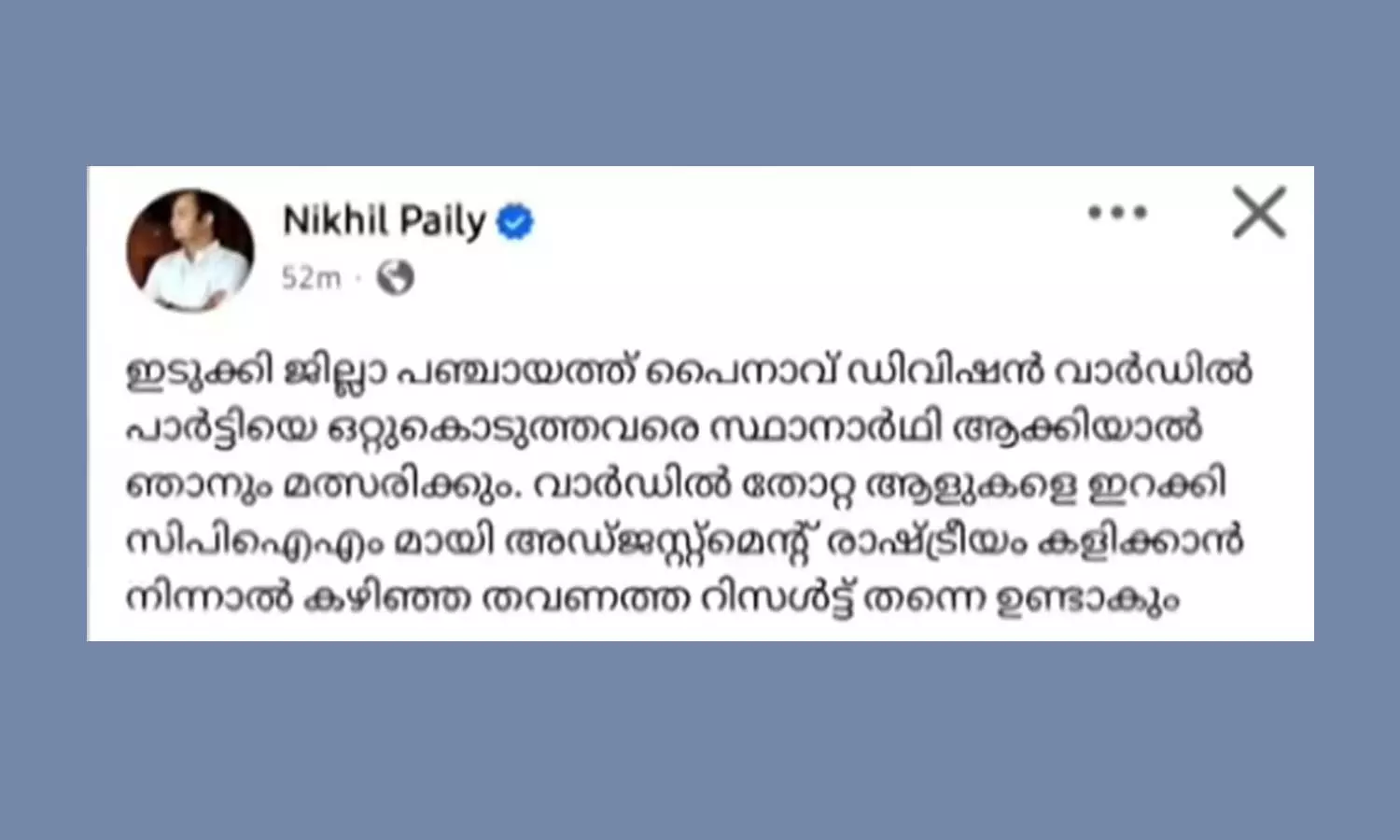 'ജില്ലാ പഞ്ചായത്ത് പൈനാവ് ഡിവിഷനിൽ പാർട്ടിയെ ഒറ്റുകൊടുത്തവരെ സ്ഥാനാർഥി ആക്കിയാൽ ഞാനും മത്സരിക്കും. വാർഡിൽ തോറ്റ ആളുകളെ ഇറക്കി സിപിഎമ്മുമായി അഡ്ജസ്റ്റ്മെന്റ് രാഷ്ട്രീയം കളിക്കാൻ നിന്നാൽ കഴിഞ്ഞ തവണത്തെ റിസൽട്ട് ഉണ്ടാകും'- എന്നാണ് നിഖിൽ പൈലിയുടെ ഫേസ്ബുക്ക് പോസ്റ്റ്.