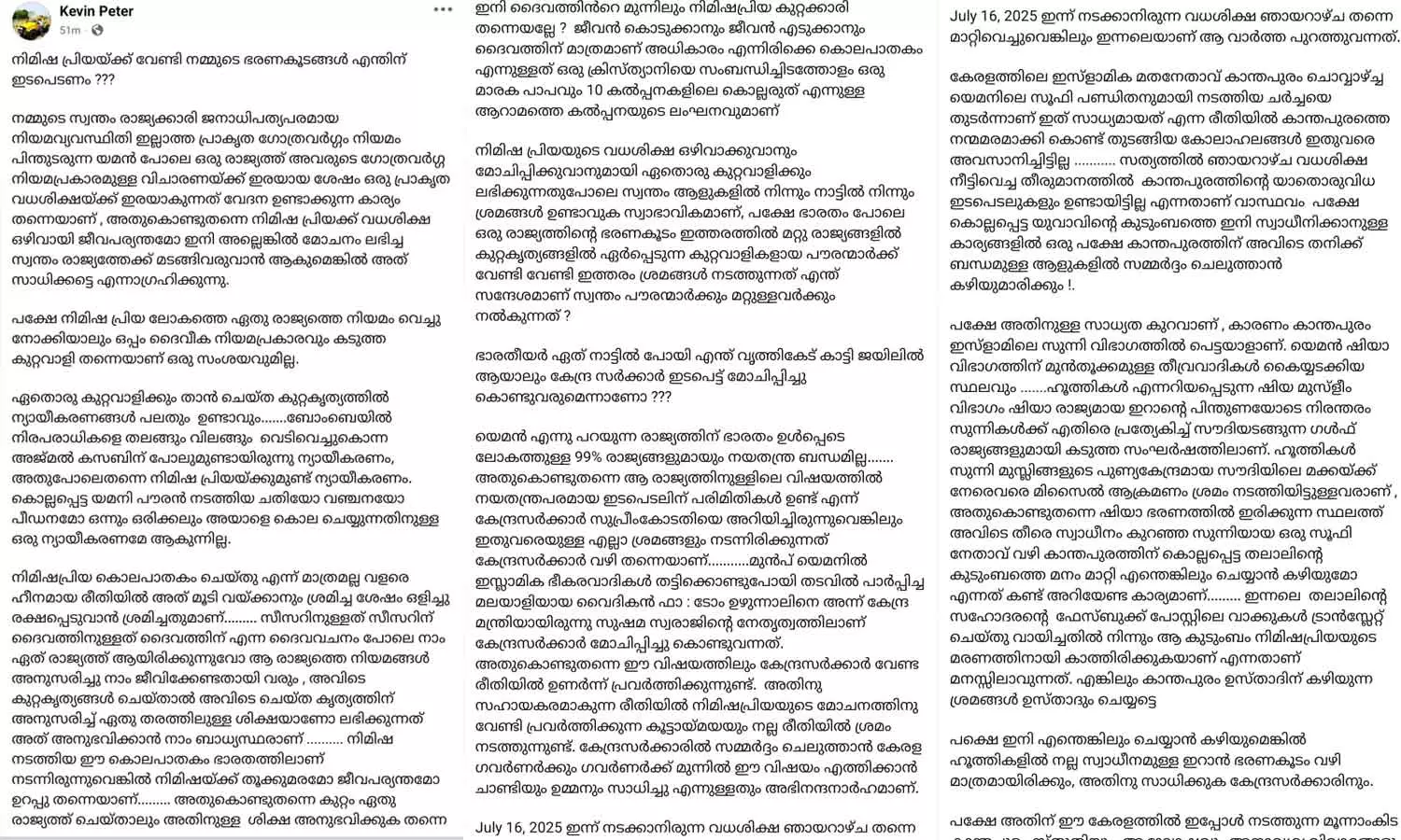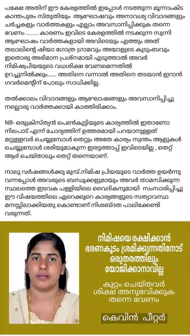 ഞായറാഴ്ച വധശിക്ഷ നീട്ടിവെച്ച തീരുമാനത്തിൽ കാന്തപുരത്തിന്റെ യാതൊരുവിധ ഇടപെടലുകളും ഉണ്ടായിട്ടില്ല എന്നതാണ് വാസ്തവം. പക്ഷേ കൊല്ലപ്പെട്ട യുവാവിന്റെ കുടുംബത്തെ ഇനി സ്വാധീനിക്കാനുള്ള കാര്യങ്ങളിൽ ഒരു പക്ഷേ കാന്തപുരത്തിന് അവിടെ തനിക്ക് ബന്ധമുള്ള ആളുകളിൽ സമ്മർദ്ദം ചെലുത്താൻ കഴിയുമാരിക്കും. പക്ഷേ കേരളത്തിൽ ഇപ്പോൾ നടത്തുന്ന മൂന്നാംകിട കാന്തപുരം സ്തുതിയും ആഘോഷവും അനാവശ്യ വിവാദങ്ങളും ചർച്ചകളും വാർത്തകളും എല്ലാം അവസാനിപ്പിക്കുക തന്നെ വേണമെന്നും കെവിൻ പീറ്റർ പറയുന്നു.