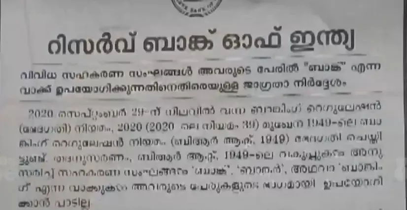 സഹകരണ സംഘങ്ങളുടെ പേരില് 'ബാങ്ക്' വേണ്ട; മുന്നറിയിപ്പുമായി റിസര്വ് ബാങ്ക്