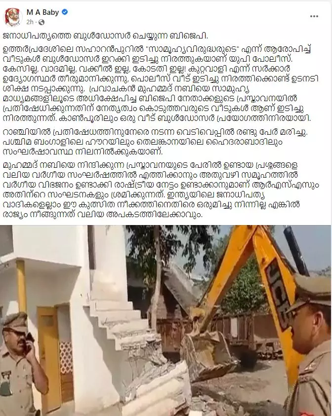'ഉത്തർപ്രദേശിലെ സഹാറൻപുറിൽ 'സാമൂഹ്യവിരുദ്ധരുടെ' എന്ന് ആരോപിച്ച് വീടുകൾ ബുൾഡോസർ ഇറക്കി ഇടിച്ചുനിരത്തുകയാണ് യു.പി പൊലീസ്. കേസില്ല, വാദമില്ല, വക്കീൽ ഇല്ല, കോടതി ഇല്ല! കുറ്റവാളി എന്ന് സർക്കാർ ഉദ്യോഗസ്ഥർ തീരുമാനിക്കുന്നു, പൊലീസ് വീട് ഇടിച്ചുനിരത്തിക്കൊണ്ട് ഉടനടി ശിക്ഷ നടപ്പാക്കുന്നു. പ്രവാചകൻ മുഹമ്മദ് നബിയെ സാമുഹ്യ മാധ്യമങ്ങളിലൂടെ അധിക്ഷേപിച്ച ബി.ജെ.പി നേതാക്കളുടെ പ്രസ്താവനയിൽ പ്രതിഷേധിക്കുന്നതിന് നേതൃത്വം കൊടുത്തവരുടെ വീടുകളാണ് ഇടിച്ചുനിരത്തുന്നത്. കാൺപൂരിലും ഒരു വീട് ബുൾഡോസർ പ്രയോഗത്തിനിരയായെന്നും എം.എ ബേബി വിശദമാക്കി.