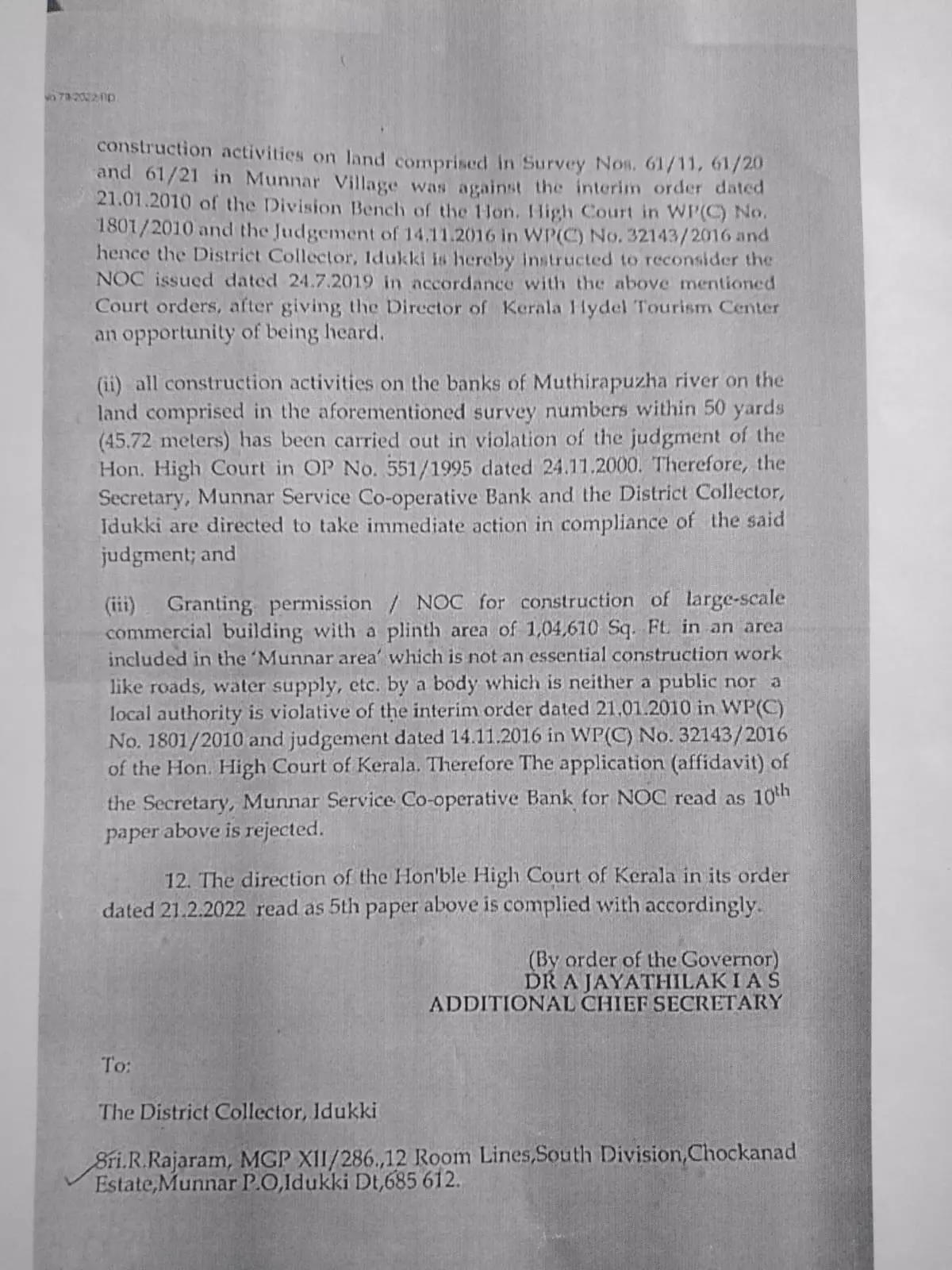 |നിർമാണ പ്രവർത്തനങ്ങൾക്ക് എൻ.ഒ. സി നൽകില്ലെന്ന് ചീഫ് സെക്രട്ടറി അറിയിച്ചു