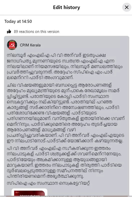 ചില വിഷയങ്ങളുമായി ബന്ധപ്പെട്ട ആരോപണങ്ങൾ അദ്ദേഹം മുഖ്യമന്ത്രിയുടെ മുൻപാകെ രേഖാമൂലം സമർപ്പിച്ചിട്ടുണ്ട്. പരാതിയുടെ കോപ്പി പാർടി സംസ്ഥാന സെക്രട്ടറിക്കും നൽകിയിട്ടുണ്ട്. പരാതിയിൽ പറഞ്ഞ കാര്യങ്ങൾ സർക്കാരിന്റെ അന്വേഷണത്തിലും, പാർടി പരിശോധിക്കേണ്ട വിഷയങ്ങൾ പാർടിയുടെ പരിഗണനയിലുമാണ്. വസ്തുതകൾ ഇതായിരിക്കെ ഗവൺമെന്റിനും, പാർടിക്കുമെതിരെ അദ്ദേഹം തുടർച്ചയായ ആരോപണങ്ങൾ മാധ്യമങ്ങൾ വഴി പ്രചരിപ്പിച്ചുവരികയാണ്. പി.വി അൻവർ എം.എൽ.എയുടെ ഈ നിലപാടിനോട് പാർടിക്ക് യോജിക്കാൻ കഴിയുന്നതല്ല.