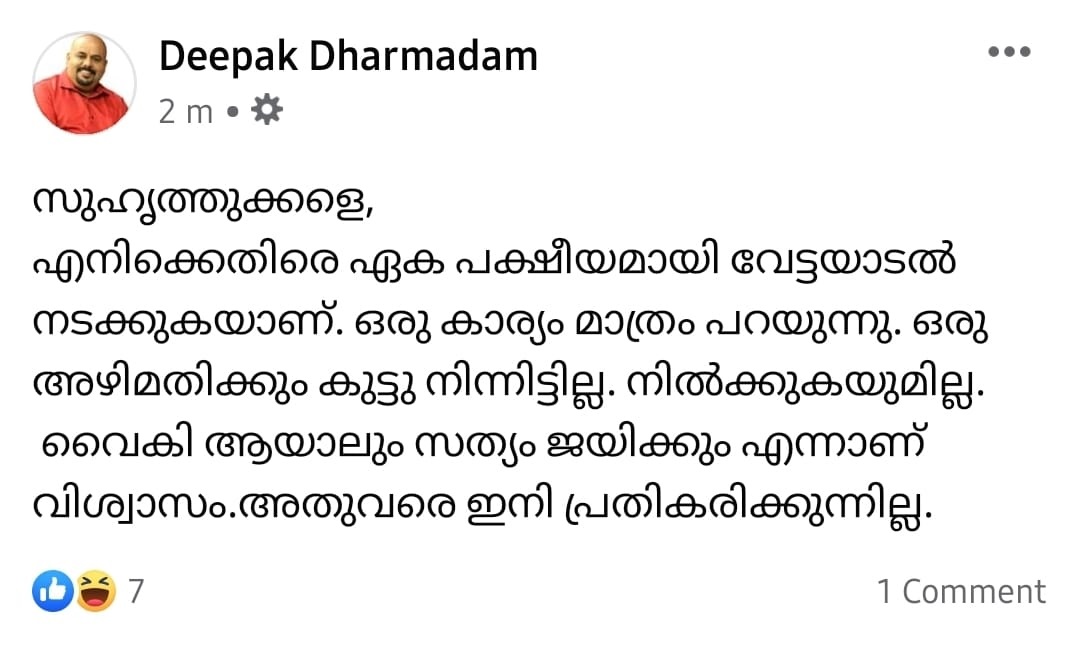 ദീപക് ധര്മടത്തിന്റെ ഫേസ്ബുക്ക് പോസ്റ്റ്: