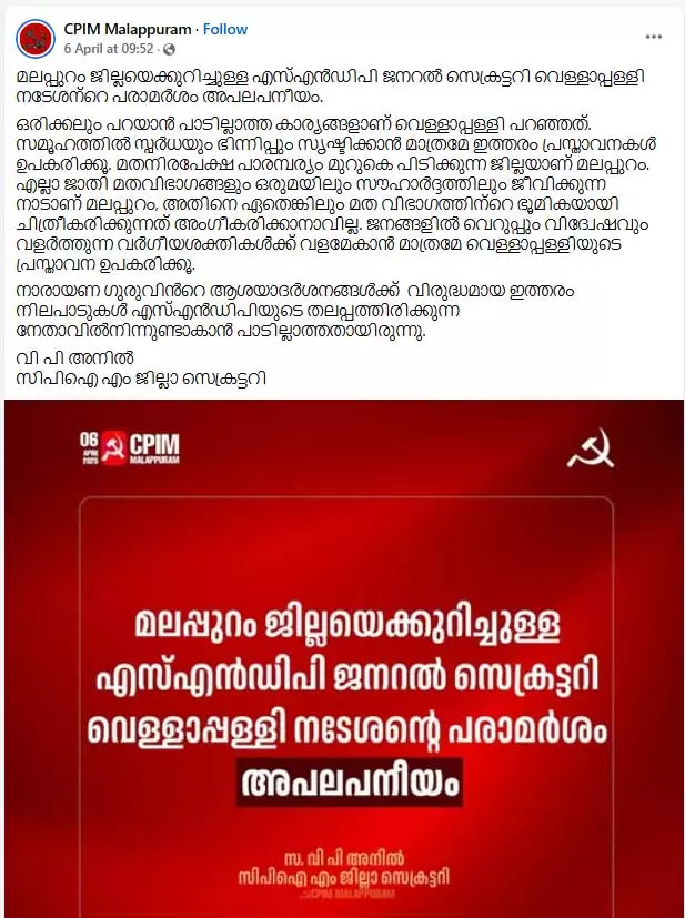 |മലപ്പുറത്തിനെതിരായ വെള്ളാപ്പള്ളിയുടെ പ്രസ്താവന അപലപനീയമെന്ന് വി.പി അനിൽ, വിമർശിച്ചത് ഒരു പാർട്ടിയെയെന്ന് പിണറായി വിജയൻ