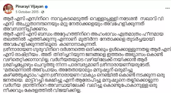 ശ്രീനാരായണ ഗുരുവിന്റെ ദർശനത്തെ ഒരിക്കലും ഉൾക്കൊള്ളുന്നതല്ല ആർഎസ്എസ് രാഷ്ട്രീയം. അത് തിരിച്ചറിയുന്ന ജനങ്ങളെ ഇത്തരം അഭ്യാസം കൊണ്ട് വഴിതെറ്റിക്കാനാവില്ല. വർഗീയതയുടെ വഴിയിലേക്ക് നയിക്കാൻ ആര് ശ്രമിച്ചപ്പോഴും ചെറുത്തുനിന്ന പാരമ്പര്യമാണ് ശ്രീനാരായണീയരുടേത്. "മതമെന്നാൽ അഭിപ്രായം, അതേതായാലും മനുഷ്യന് ഒരുമിച്ചു കഴിഞ്ഞുകൂടാം" എന്ന ശ്രീനാരായണ വാക്യം നെഞ്ചിൽ കൊണ്ട് നടക്കുന്ന ഒരു ജനതയെ, മാട്ടിറച്ചി ഭക്ഷിച്ചു എന്ന് ആരോപിച്ചു മനുഷ്യനെ തല്ലിക്കൊല്ലുന്ന വർഗീയ ഭ്രാന്തിന്റെ അവസ്ഥയിലേക്ക് വലിച്ചു കൊണ്ടുപോകാനുള്ള ഒരു നീക്കവും കേരളത്തിൽ വിജയിക്കില്ല’ -2015 ഒക്ടോബർ അഞ്ചിനുള്ള പോസ്റ്റിൽ പിണറായി വിജയൻ വ്യക്തമാക്കി.
