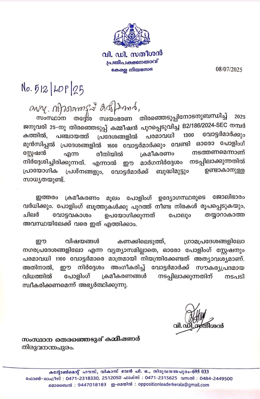 തദ്ദേശ തെരഞ്ഞെടുപ്പിൽ പോളിങ് ബൂത്തിലെ വോട്ടർമാരുടെ എണ്ണം 1100 ആയി പരിമിതപ്പെടുത്തണം; തെരഞ്ഞെടുപ്പ് കമ്മീഷണർക്ക് പ്രതിപക്ഷ നേതാവ് കത്ത് നൽകി