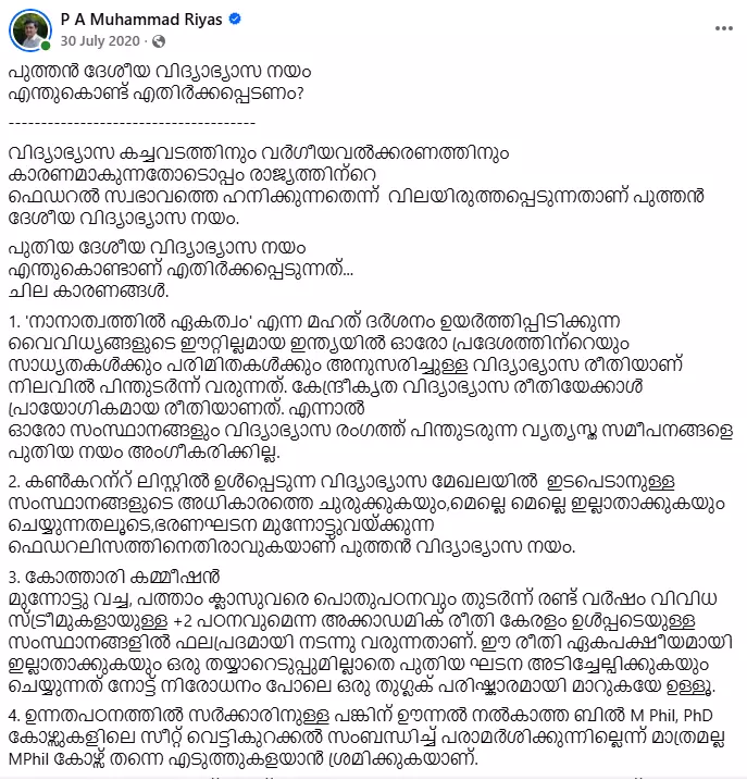 |കൺകറന്റ് ലിസ്റ്റിൽ ഉൾപ്പെടുന്ന വിദ്യാഭ്യാസ മേഖലയിൽ ഇടപെടാനുള്ള സംസ്ഥാനങ്ങളുടെ അധികാരത്തെ ചുരുക്കുകയും,മെല്ലെ മെല്ലെ ഇല്ലാതാക്കുകയും ചെയ്യുന്നതിലൂടെ,ഭരണഘടന മുന്നോട്ടുവയ്ക്കുന്ന ഫെഡറലിസത്തിനെതിരാവുകയാണ് പുത്തൻ വിദ്യാഭ്യാസ നയമെന്നും റിയാസ് 2020 ൽ ഫേസ്ബുക്കിൽ പങ്കുവെച്ച പോസ്റ്റിൽ വിശദീകരിക്കുന്നു