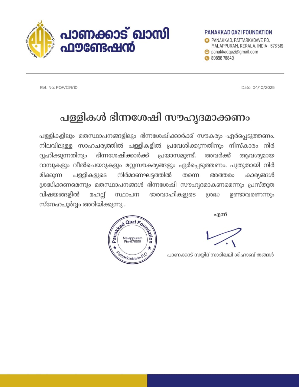 അവർക്ക് ആവശ്യമായ റാമ്പുകളും വീൽചെയറുകളും മറ്റുസൗകര്യങ്ങളും ഏർപ്പെടുത്തണം. പുതുതായി നിർമിക്കുന്ന പള്ളികളുടെ നിർമാണഘട്ടത്തിൽ തന്നെ അത്തരം കാര്യങ്ങൾ ശ്രദ്ധിക്കണമെന്നും മതസ്ഥാപനങ്ങൾ ഭിന്നശേഷി സൗഹൃദമാക്കണമെന്നും പാണക്കാട് ഖാസി ഫൗണ്ടേഷൻ മഹല്ലുകളോട് ആവശ്യപ്പെട്ടു.