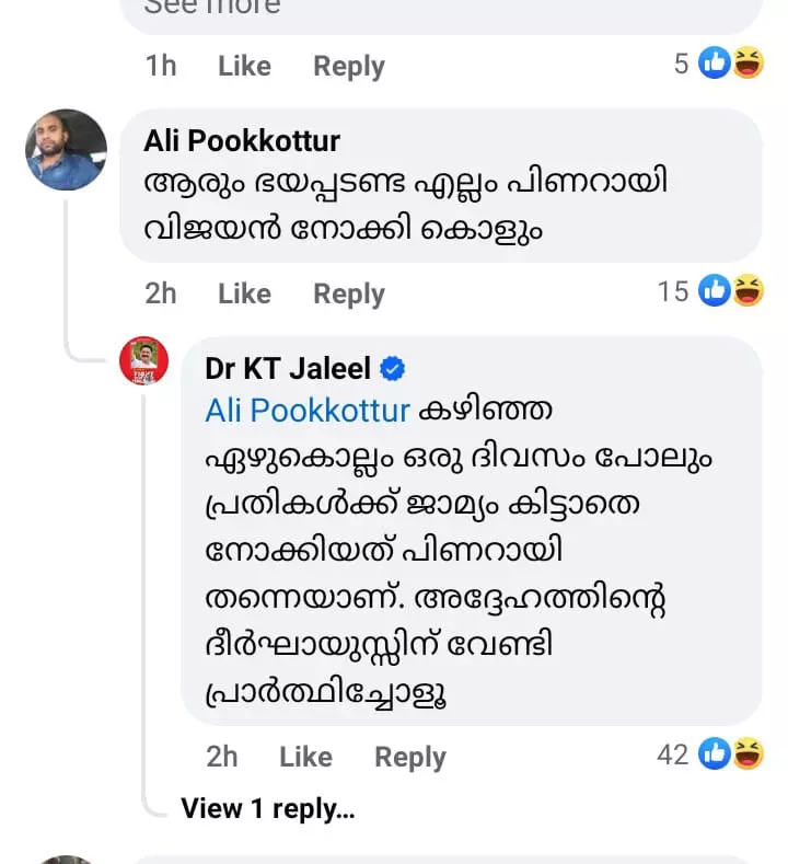 കോഴിക്കോട്: റിയാസ് മൗലവി വധക്കേസിലെ പ്രതികൾക്ക് കഴിഞ്ഞ ഏഴുകൊല്ലത്തിനിടെ ഒരു ദിവസം പോലും ജാമ്യം കിട്ടാതെ നോക്കിയത് മുഖ്യമന്ത്രി പിണറായി വിജയനാണെന്ന് ഡോ. കെ.ടി. ജലീൽ എം.എൽ.എ. പ്രതികളെ വെറുതെ വിട്ടത് ഞെട്ടിക്കുന്ന വിധിയാണെന്ന് ചൂണ്ടിക്കാട്ടി കെ.ടി. ജലീൽ ഫേസ്ബുക്കിലിട്ട പോസ്റ്റിന് താഴെ വന്ന കമന്റിന് മറുപടി നൽകുകയായിരുന്നു അദ്ദേഹം. ‘കഴിഞ്ഞ ഏഴുകൊല്ലം ഒരു ദിവസം പോലും പ്രതികൾക്ക് ജാമ്യം കിട്ടാതെ നോക്കിയത് പിണറായി തന്നെയാണ്. അദ്ദേഹത്തിൻ്റെ ദീർഘായുസ്സിന് വേണ്ടി പ്രാർത്ഥിച്ചോളൂ’ -എന്നായിരുന്നു കെ.ടി. ജലീലിന്റെ കമന്റ്.