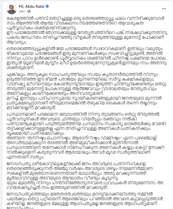 ഈ പരാജയത്തിൽ ഞാനടക്കമുള്ള നേതൃത്വത്തിന്റെ പങ്ക് നിഷേധിക്കുന്നതിനു പകരം ജനഹിതം തിരിച്ചറിഞ്ഞു വീഴ്ചകൾ തിരുത്തിയുള്ള മുന്നോട്ട് പോക്കാണ് ആവശ്യം.