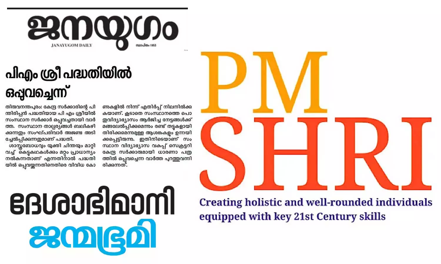 പിഎം ശ്രീ പദ്ധതിയിൽ ഒപ്പുവച്ചെന്ന് ജനയുഗം, വാർത്തനൽകാതെ ജന്മഭൂമിയും ദേശാഭിമാനിയും