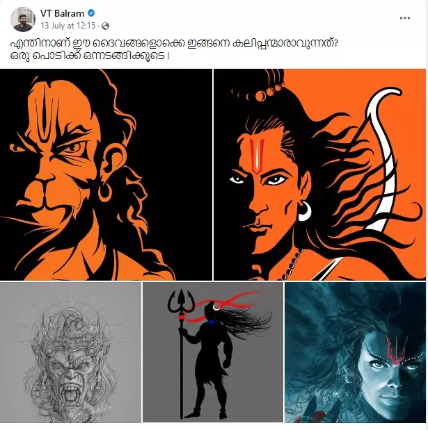 പുതിയ പാർലമെന്റ് കെട്ടിടത്തിലെ അശോക സ്തംഭ സിംഹങ്ങൾക്ക് ഭാവ വ്യത്യാസമുണ്ടെന്ന വിമർശനങ്ങളോടുള്ള പരോക്ഷ വിമർശനമാണ് വി.ടി ബൽറാം ഫേസ്ബുക്ക് പോസ്റ്റിലൂടെ പങ്കുവെച്ചിരുന്നത്. 'എന്തിനാണ് ഈ ദൈവങ്ങളൊക്കെ ഇങ്ങനെ കലിപ്പന്മാരാവുന്നത്? ഒരു പൊടിക്ക് ഒന്നടങ്ങിക്കൂടെ' എന്നാണ് അദ്ദേഹം ഫേസ്ബുക്കിൽ കുറിച്ചത്. ഹനുമാന്റെയും ശിവന്റെയും ചിത്രങ്ങൾ പങ്കുവെച്ചുകൊണ്ടായിരുന്നു വി.ടി ബൽറാമിന്റെ ചോദ്യം.