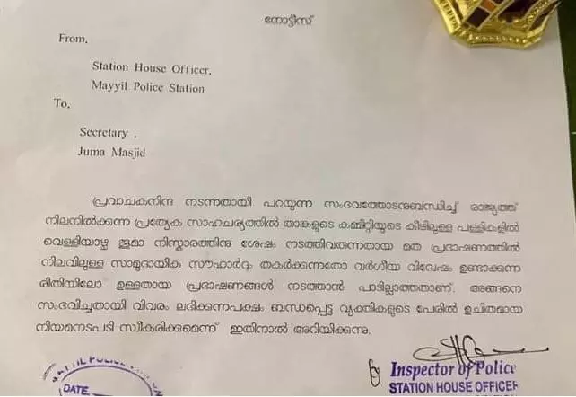 Summary: Police warn masjid committees in Kannur that action will be taken if they make hate speech after Juma prayer